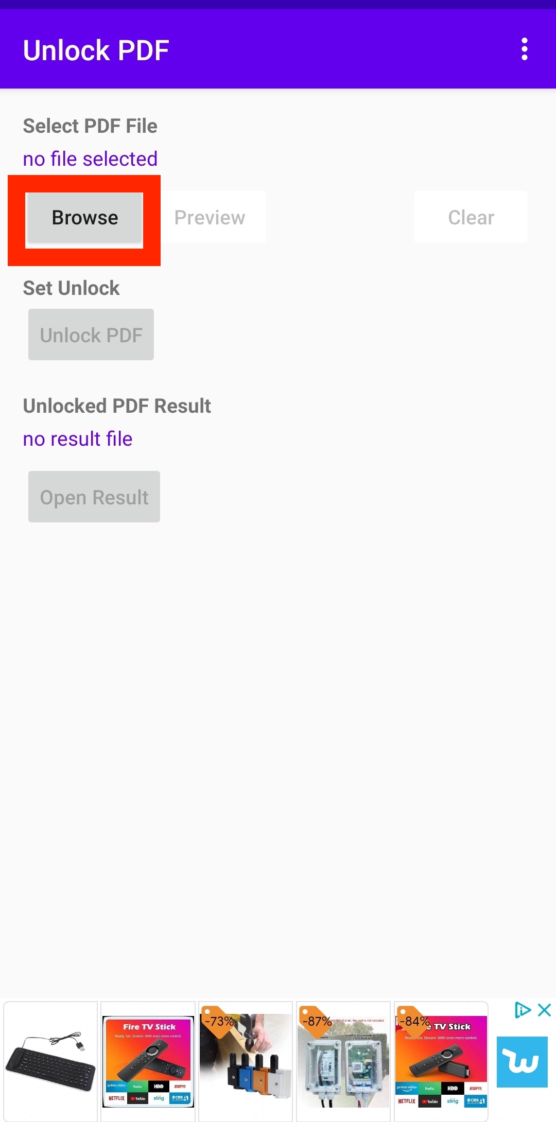 Per utilizzare questa applicazione abbiamo bisogno di un file PDF con password protetta. Una volta che siamo in possesso del file PDF occorre aprire l’app cliccare su Browse