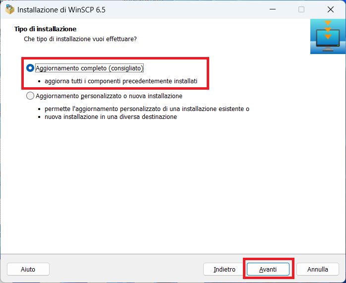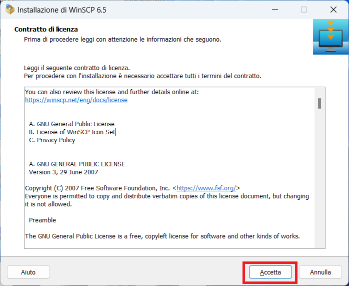 Per scaricare WinSCP apri il browser, vai sul sito ufficiale https://winscp.net, clicca su <<Download>>, seleziona la versione più recente (installazione standard o portatile), e scarica il file .exe facendo clic sul link corrispondente.