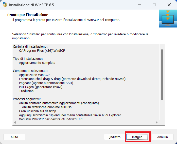 Per installare WinSCP apri il file .exe scaricato, clicca su <<Esegui>>, segui la procedura di installazione cliccando su <<Next>>, accetta i termini della licenza, scegli la cartella di destinazione, seleziona le componenti aggiuntive come integrazione con Windows Explorer o supporto per linguaggi, crea eventualmente un’icona sul desktop o nel menu Start, clicca su <<Install>> per completare l’installazione e infine su <<Finish>>.