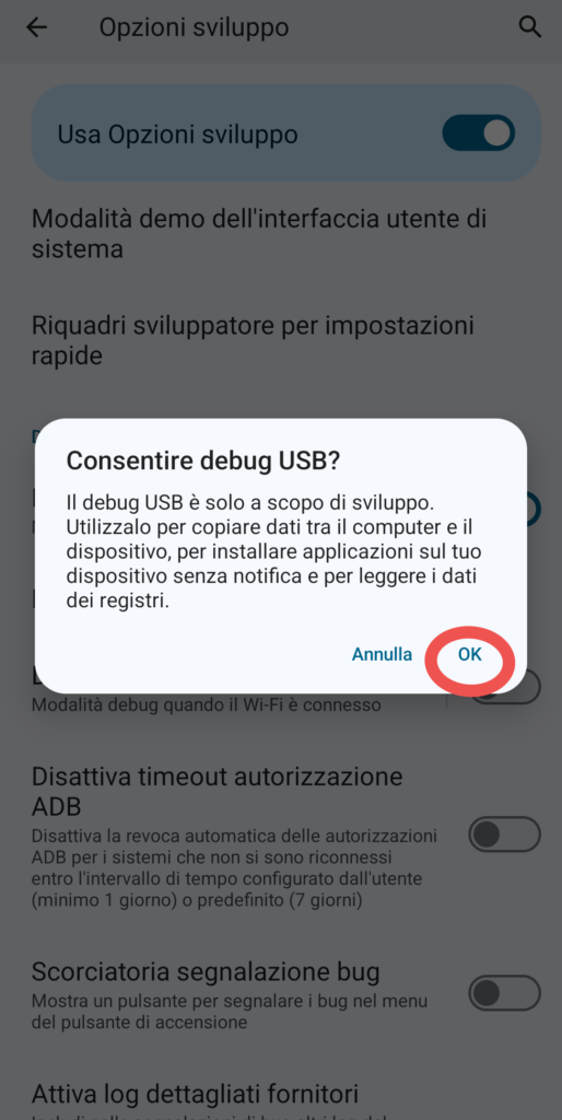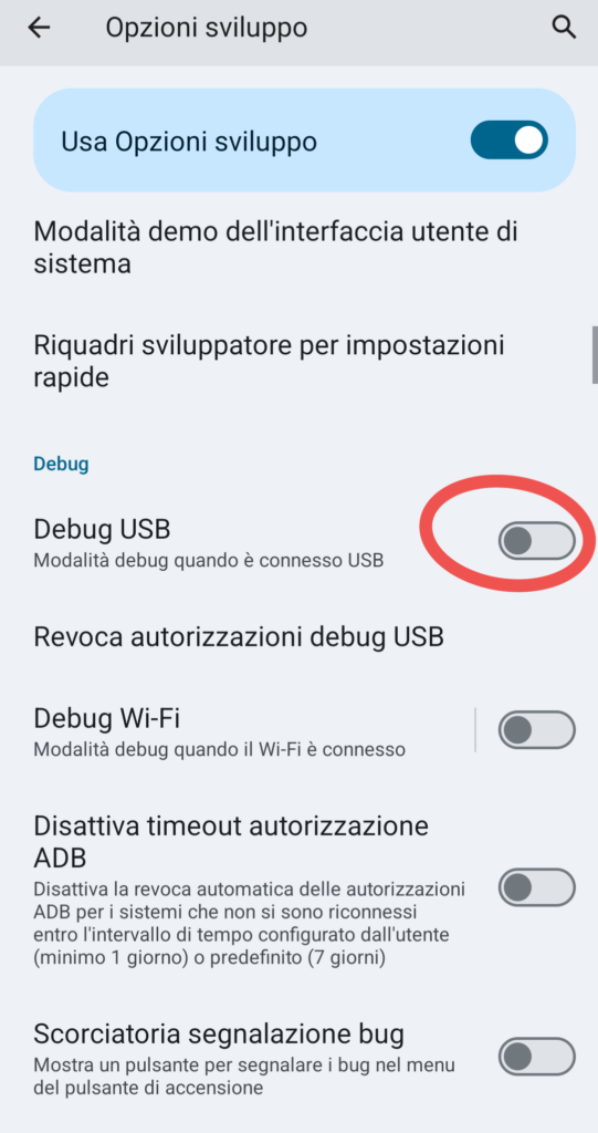 Vai su Opzioni sviluppatore oppure Opzioni di sviluppo su dispositivi Motorola e derivati, e attiva Debug USB.