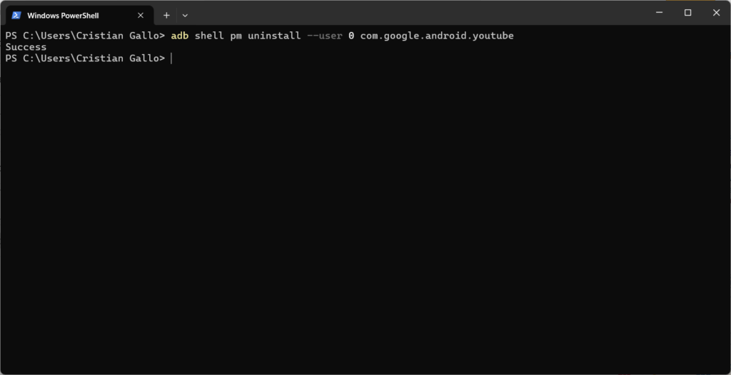 adb shell pm uninstall --user 0 com.google.android.youtube