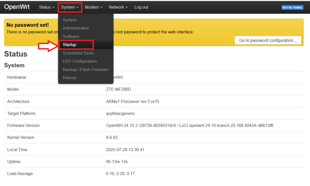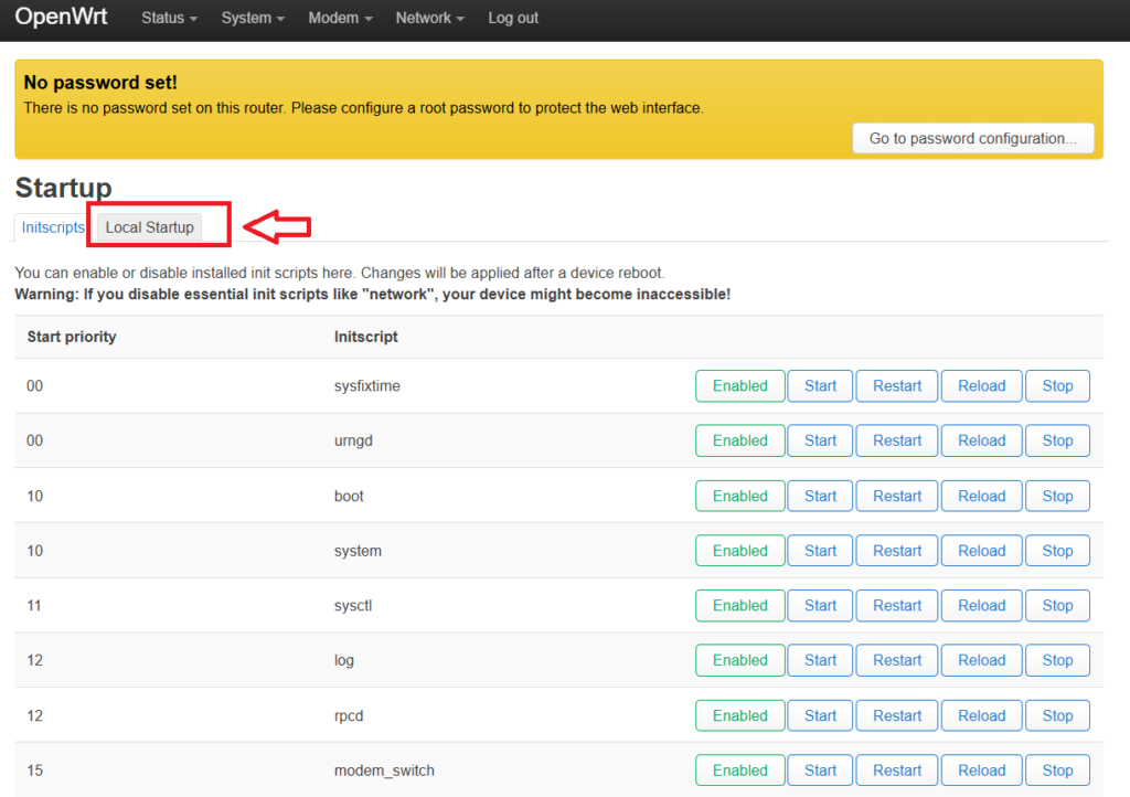 Vai su System > Startup, in alto trova la scritta Local Startup, e aggiungi questo script prima di exit 0: