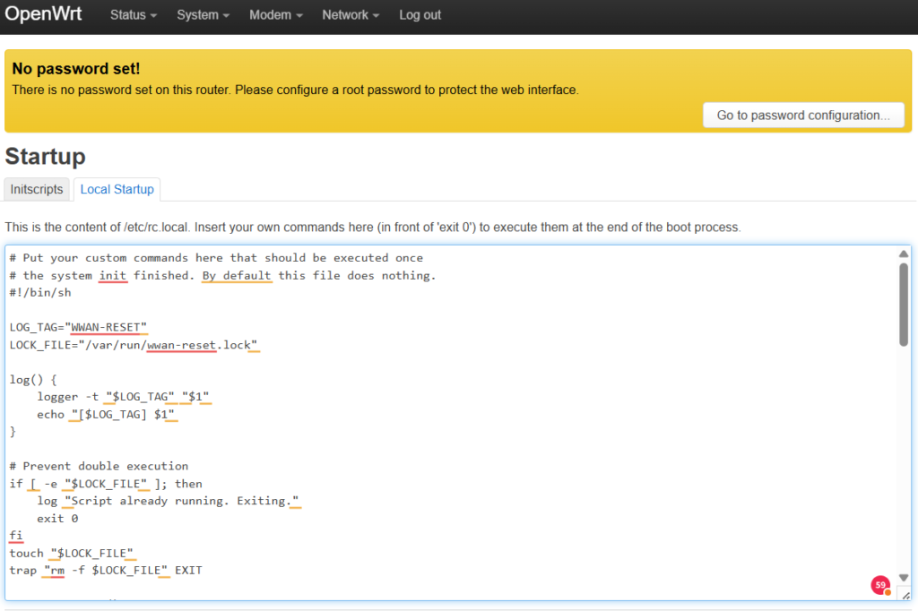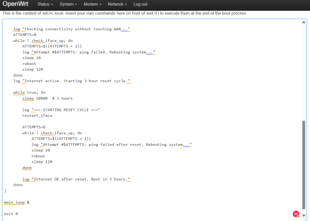 sleep 10800 # 10800 secondi = 3 oreSe utilizzate SIM Very Mobile o WindTre, potete modificare il valore dello sleep da 10800 a 13800. In questo modo, lo script eseguirà il reset dell’interfaccia WAN ogni 3 ore e 50 minuti. Questa operazione anticipa il cambio IP che avviene ogni 4 ore su queste SIM, evitando così la disconnessione o il passaggio automatico da 4G a 3G, problema comune con SIM Very Mobile e WindTre.