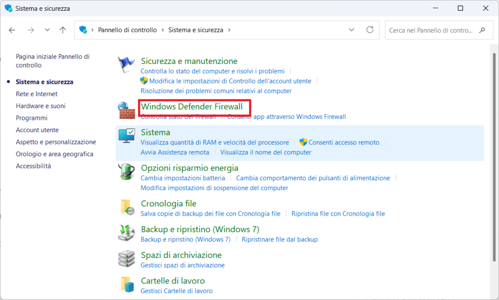 - Vai su Pannello di controllo > Sistema e sicurezza > Windows Defender Firewall