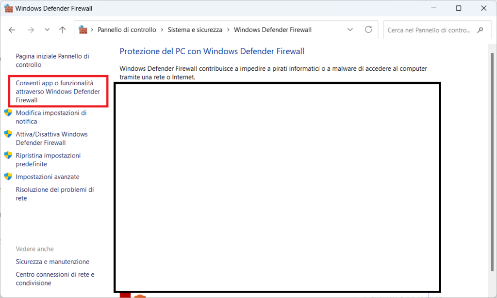- Clicca su <<Consenti app o funzionalità tramite Windows Defender Firewall>>
