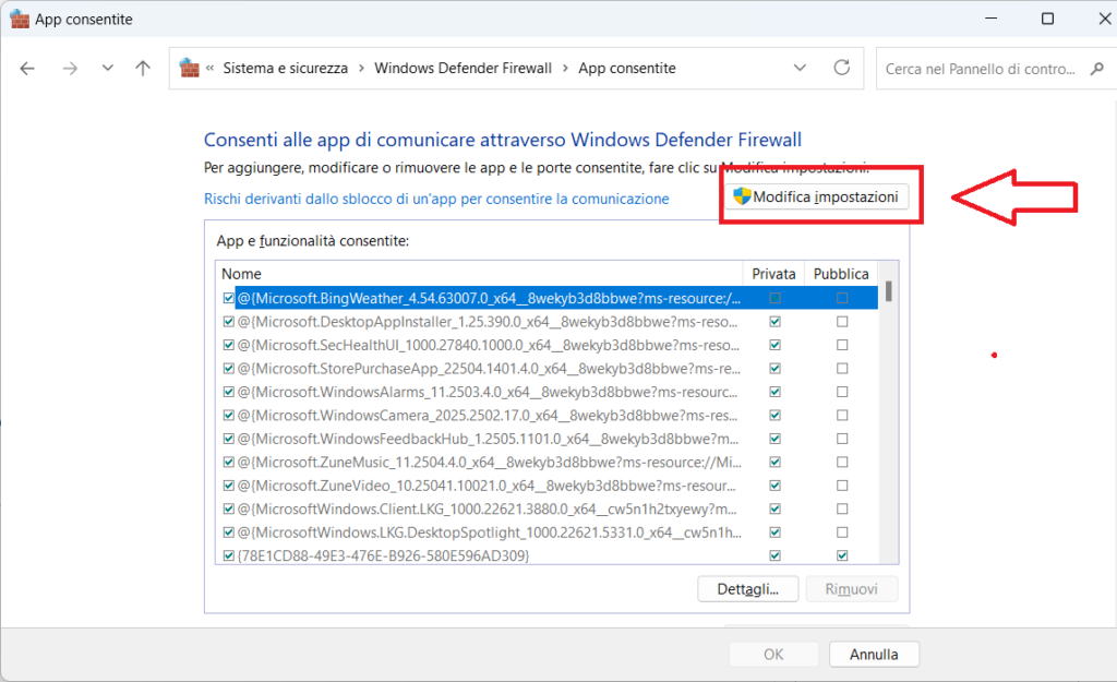 - Clicca ora su <<Modifica impostazioni>> e assicurati che <<Desktop>> sia selezionato per reti private e pubbliche