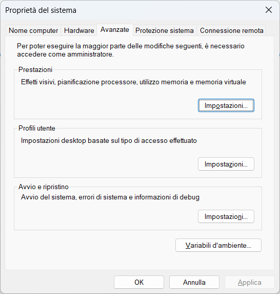 - Premi Win + Pause → <<Impostazioni di sistema avanzate>>