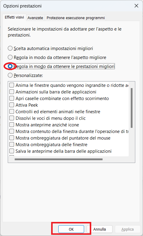 - Seleziona <<Regola per ottenere le prestazioni migliori>>