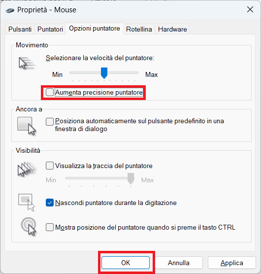 - Pannello di controllo → <<Mouse>> → scheda <<Opzioni puntatore>>