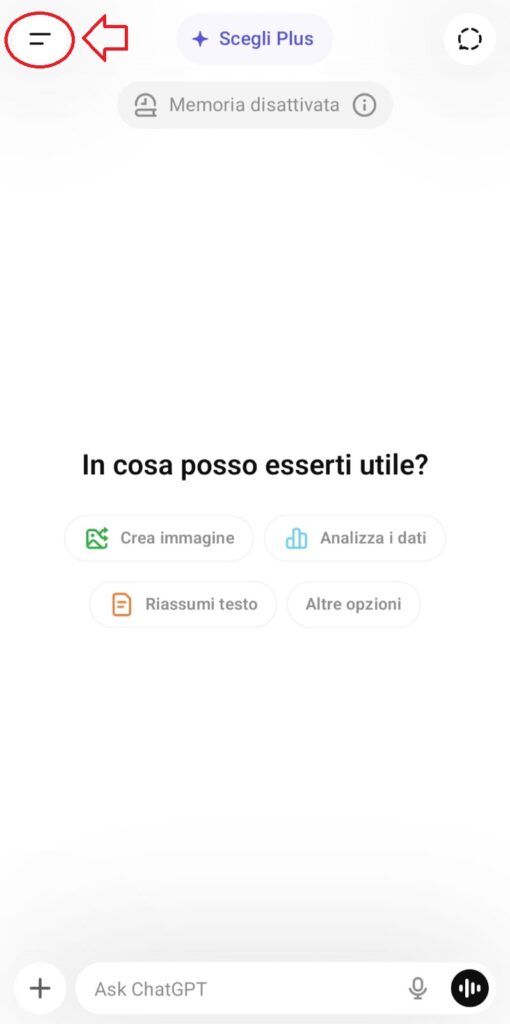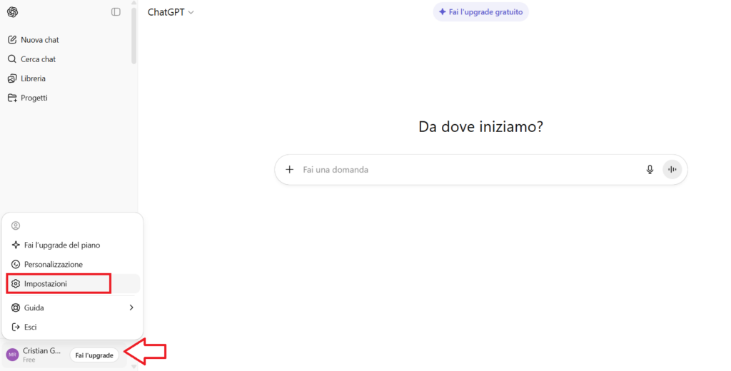 Accedi al tuo account ChatGPT, apri le Impostazioni, e clicca sull’icona dei tre trattini in alto a sinistra (Dashboard) clicca sul nome personale in basso e seleziona Impostazioni.