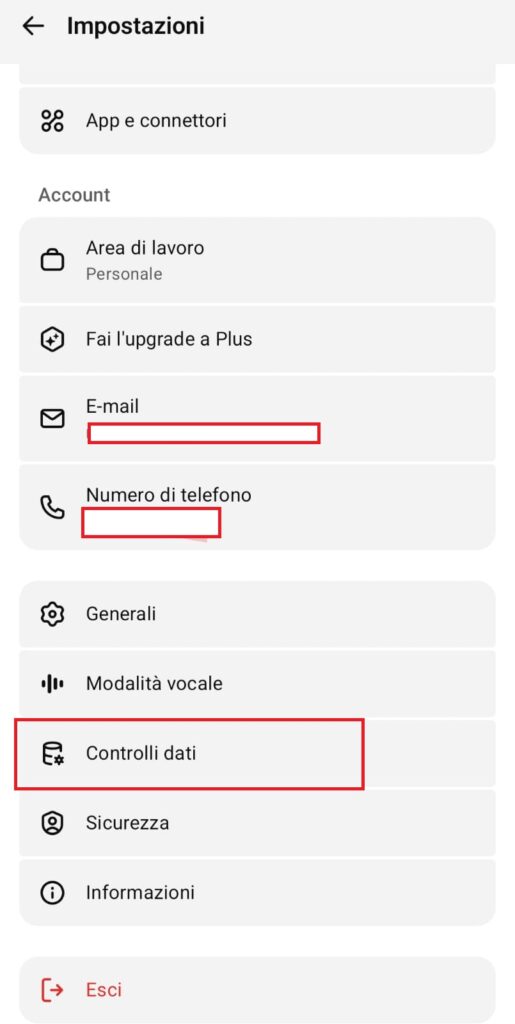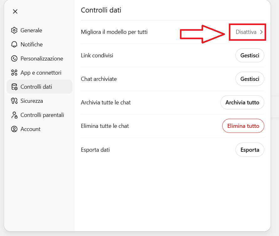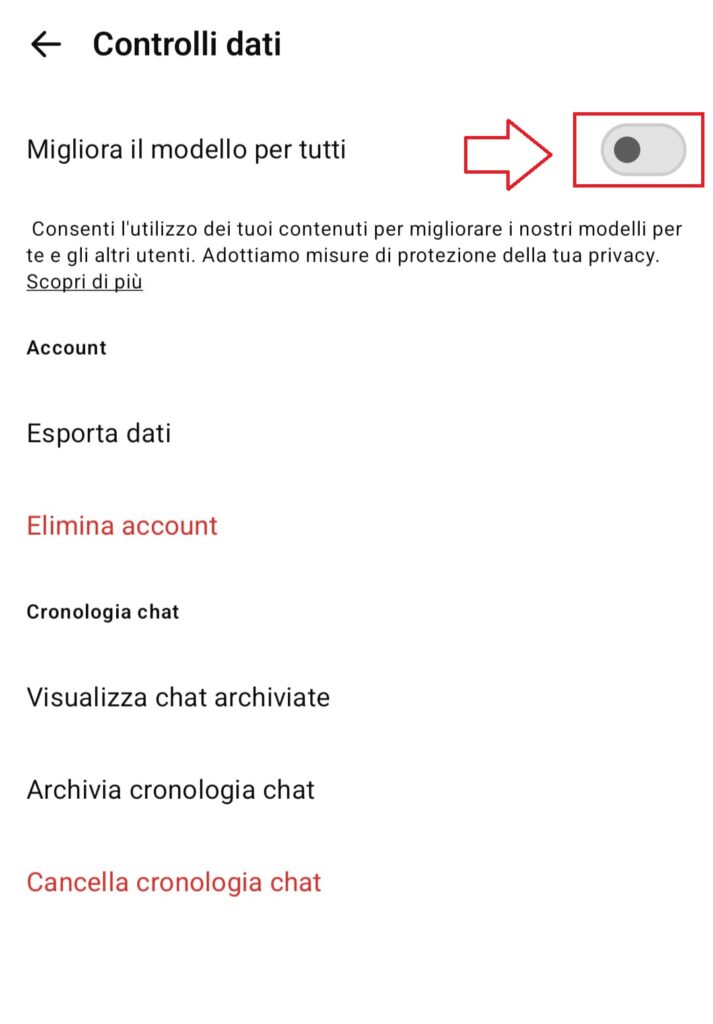 Vai alla sezione <<Privacy>>. Nel menu laterale, clicca su Privacy. Disattiva <<Controlla dati>>. Troverai l’opzione “Usa i dati per migliorare i modelli” o <<Controlla dati>>. Disattivala: questo impedirà che le tue conversazioni vengano usate per l’addestramento.
