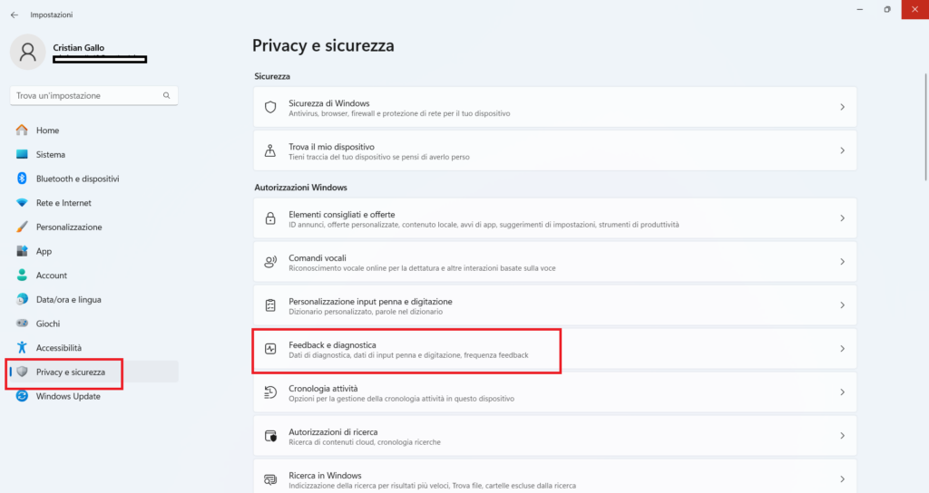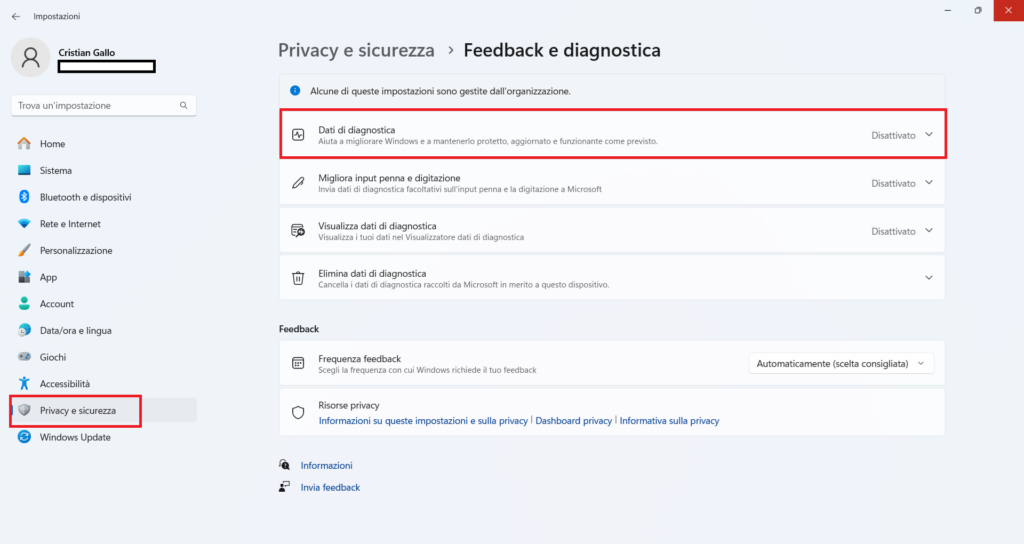Vai su Impostazioni → Privacy e sicurezza → Diagnostica e feedback. Seleziona Dati diagnostici obbligatori. Disattiva l’opzione Invia dati facoltativi.