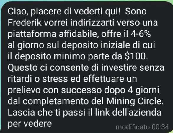 “Ciao, piacere di vederti qui! Sono Frederik vorrei indirizzarti verso una piattaforma affidabile, offre il 4-6% al giorno sul deposito iniziale di cui il deposito minimo parte da $100…”