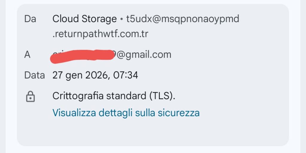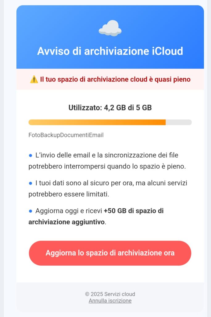 • Oggetto: qualcosa tipo “Avviso di archiviazione iCloud”, “Il tuo spazio è quasi pieno”, “Aggiorna subito per non perdere i dati”.